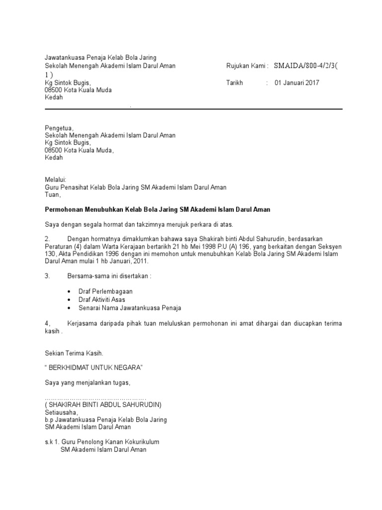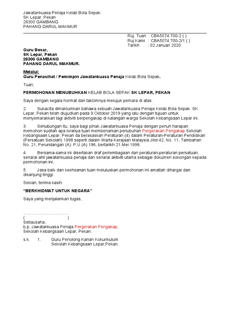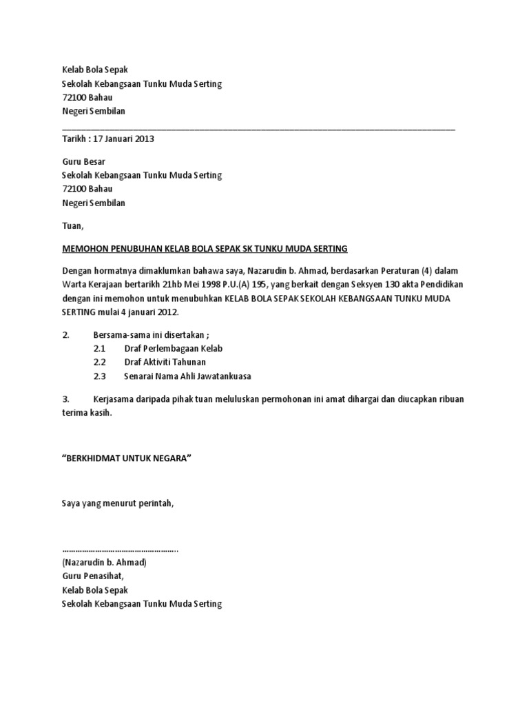 Surat Permohonan Penubuhan Kelab Bola Sepak Pdf